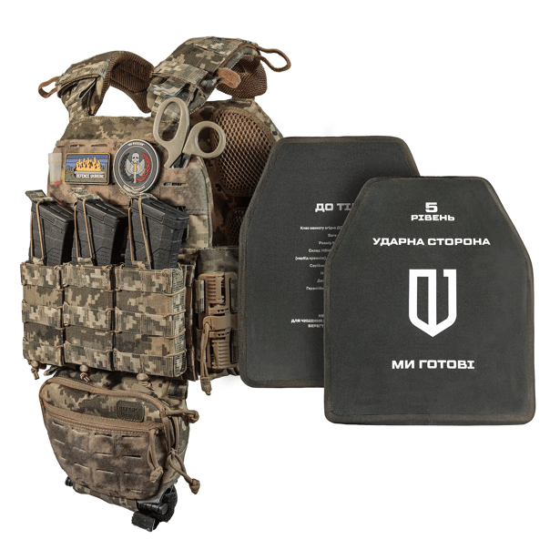 Для забезпечення максимального захисту в плитоноску КРУК підходять керамічні бронеплити 5-го класу. Виготовлені з карбіду кремнію (SiC), ці плити поєднують високу міцність та легкість, що є критично важливим для сучасних бойових умов.