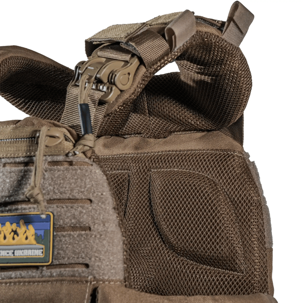 Вага самої плитоноски — всього 950 грамів. Вона легка, не сковує рухів, але сидить як треба. Носити її зручно і під час штурму, і коли просто лежиш у засідці.