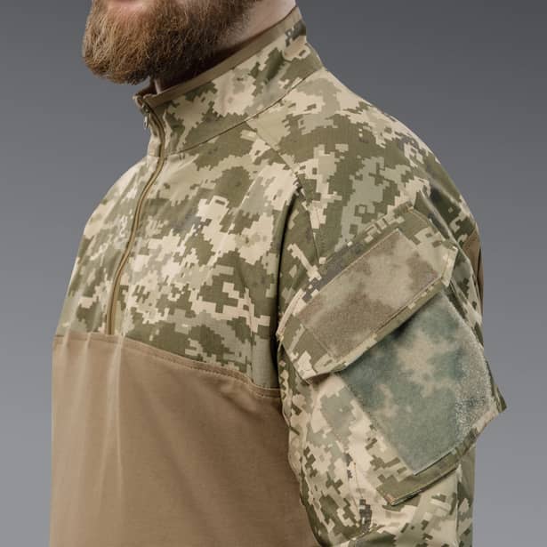 Фасон убаксу нагадує анорак, має розріз до середини грудей із змійкою — щоб швидко одягати та знімати. Комір-стійка захищає шию, а довгі рукави повністю прикривають руки (і так, їх можна закотити, коли стає спекотно). Манжети на рукавах фіксуються, тож нічого не розхлябується. Спереду та на спині — жодних зайвих деталей, які могли б заважати під бронежилетом або на завданні. Панелі велкро — для патчів і нашивок, бо крутість має бути персоналізованою.