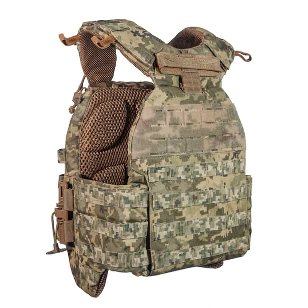 Вес самой плитоноски — всего 950 граммов. Она легкая, не сковывает движений, но сидит как надо. Носить ее удобно и во время штурма, и когда просто лежишь в засаде.